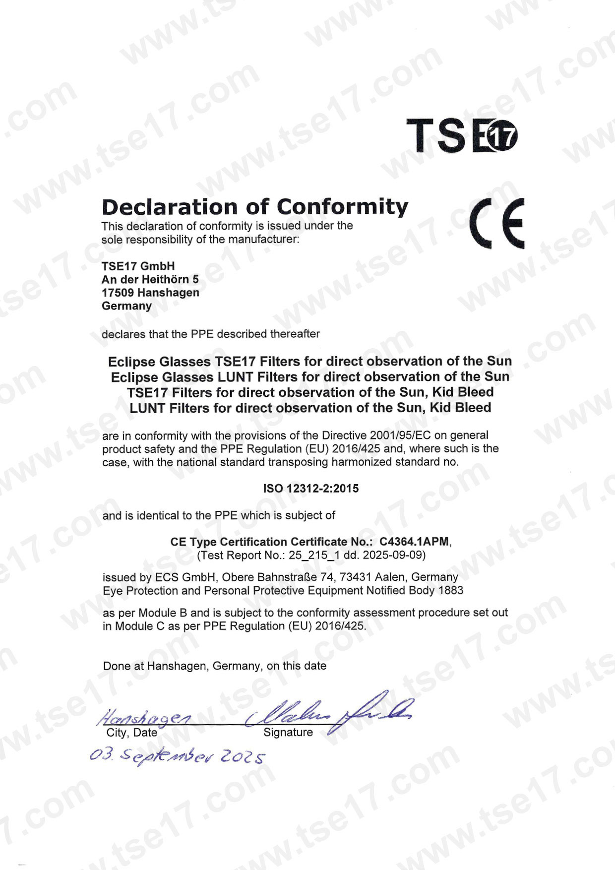 Conforms to and meets the Transmission Requirements of ISO 12312–2, Filters for Direct Observation of the Sun. Meets the Transmission Requirements of EN 1836: 2005 + A1: 2007 (E) for an E15 Filter for the Direct Observation of the Sun. Meets the Transmission Requirements of AS/NZS 1338.1:2012, Filters for Eye Protectors. In compliance with EU PPE Regulations 2016/425. EU Type Examination by: Test Report ESC GmbH – European Certification Service, D-73431 Aalen. Manufactured by: TSE17 GmbH, An der Heithörn 5, 17509 Hanshagen, GERMANY, www.tse17.com